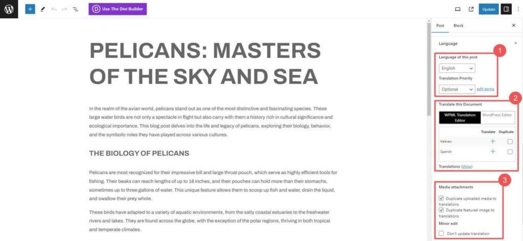 许多人都希望利用 WPML 的手动翻译流程。如果他们使用多种语言或希望外包翻译流程,他们可能会希望这样做。用户可以在块编辑器中配置如何处理帖子/页面的翻译。他们可以设置页面翻译的优先级,即时添加新的翻译,并决定如何处理该页面上的媒体翻译。