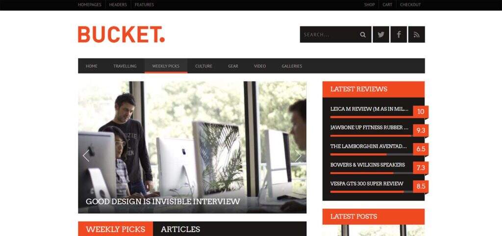 Bucket是Pixel Grade的另一个WordPress杂志主题。这个以新闻为重点的WordPress主题有各种主页布局,这样你最好的故事可以漂亮地展示给你的读者。Bucket带有一个自定义的评论系统,这样你就可以快速写出对餐馆、音乐等的评论。它包括一个分数分解的优点和缺点列表,可以自定义以符合你的品牌形象。