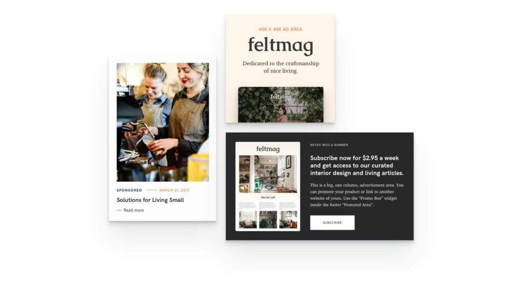 对于想要使他们的网站盈利的博主或媒体,Felt提供了专门的小部件和小部件区域来放置广告。无论您是想通过PPC盈利,还是想更多地控制推广博客文章,Felt都可以让您简单有效地在您的网站上显示广告。