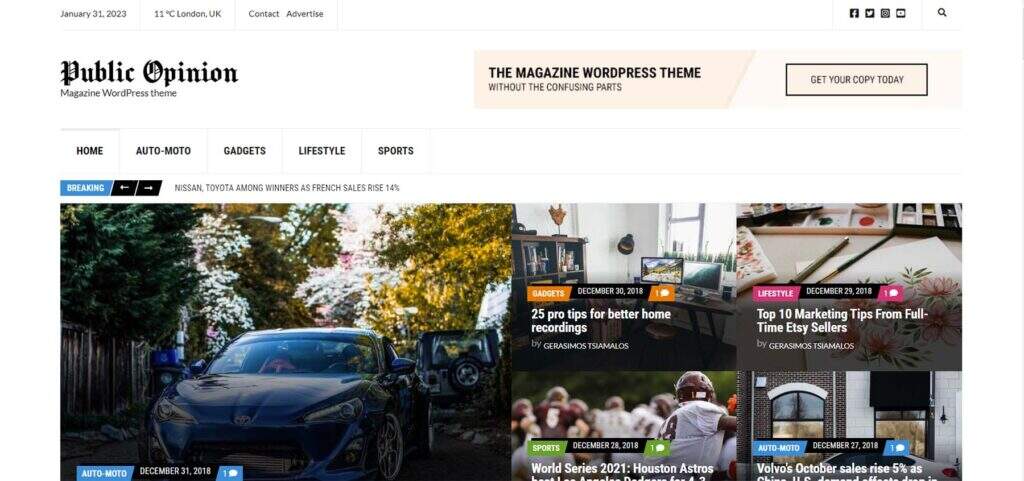 Public Opinion是另一个CSS Igniter主题,与Neuton类似。它是一个灵活的WordPress杂志主题,有广告区、突发新闻的勾选,以及多个主页选项。Public Opinion很强大,可以满足大多数在线出版的需要。它有一个以移动为重点的设计,支持翻译和WooCommerce。此外,你可以创建自定义的档案页。当与它的自定义帖子块一起使用时,你可以为你的媒体网站上使用的各种标签、类别或档案创建不同的外观和布局。