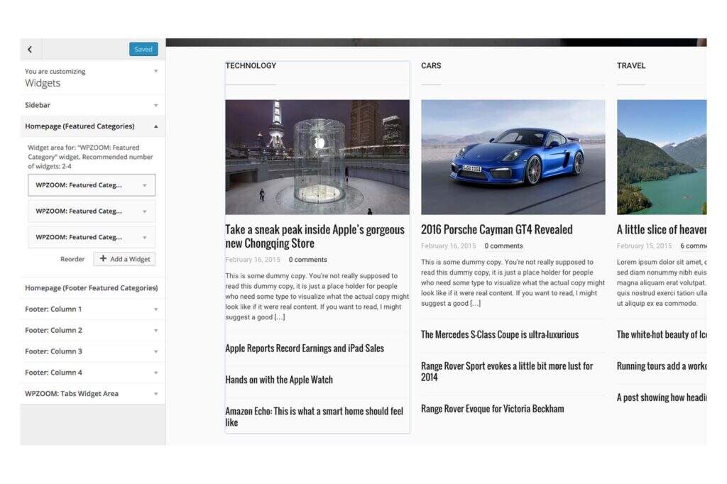 通过WPZOOM定制的杂志专用小部件来建立和定制您的主页布局。主页有多个小部件区域,因此你可以创建诱人的、有吸引力的主页,以推广和展示你的网站最精彩的博客文章。