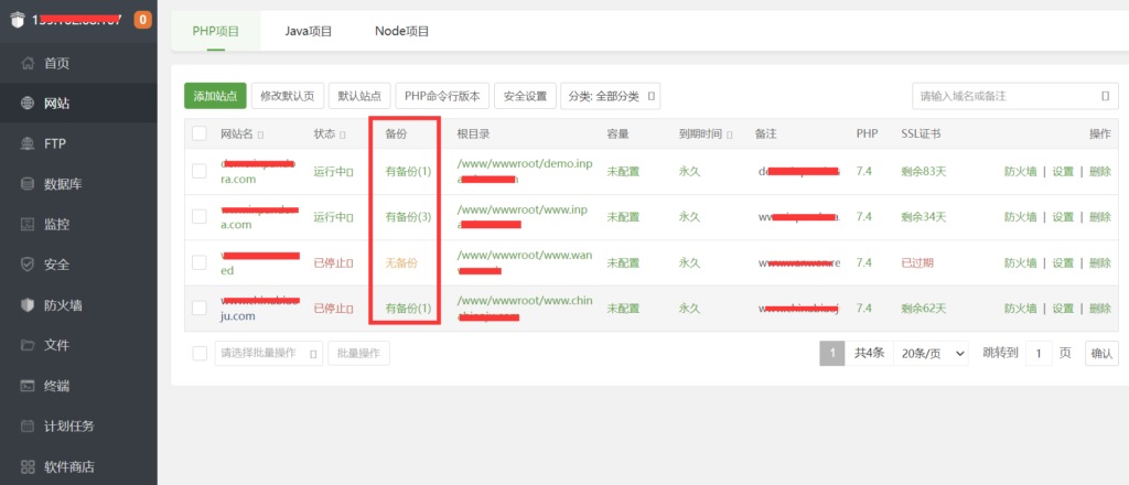 要在宝塔中访问你的备份,请进入宝塔控制面板,点击网站,在网站列表中选择您需要备份的网站,点击备份列表对应的选项。