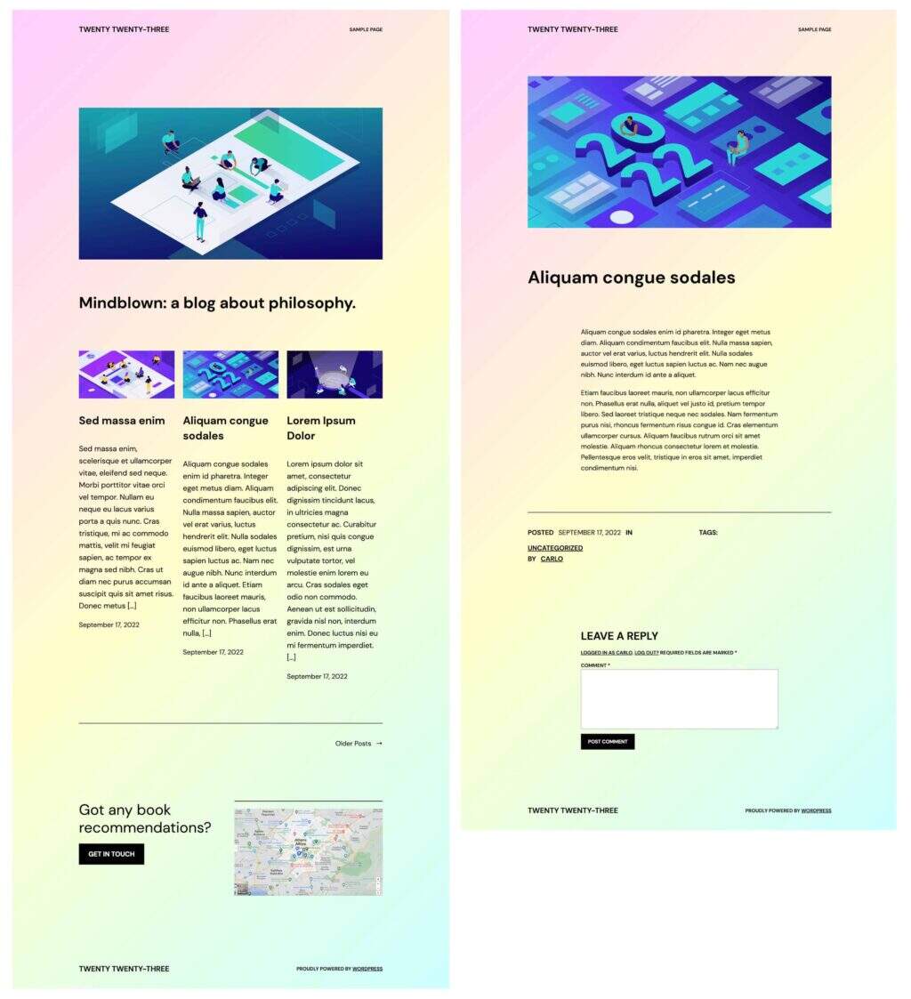 如上所述,二〇二三是二〇二二的精简版。新的默认主题引人注目的是它的简单性和轻盈性。二〇二三非常灵活,非常适合 Gutenberg 的最新站点编辑功能,例如模板编辑、全局样式变体、流体排版和区块样板模式。