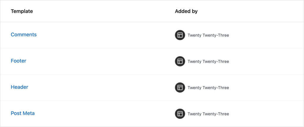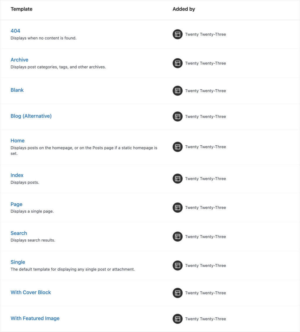 当您启动站点编辑器并在您的网站上运行二〇二三主题时,您将看到包含 11 个模板和 4 个模板部件的列表。