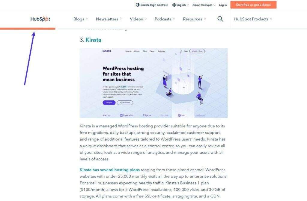 - 灵活的定位——您可以自动将进度条粘贴到页面的顶部或底部。或者,还有一个自定义定位选项,可让您将其粘贴到任何CSS元素上。例如,如果您有一个固定顶部菜单栏,您可以将其粘贴在标题导航菜单下方,而不是一直粘贴在页面顶部(如上面的HubSpot示例)。