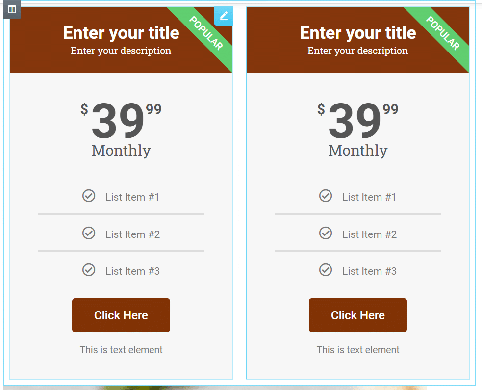 我们建议先添加一个价格表模块并对其进行样式设置。然后,您可以将该元素复制或复制到其余列中,并为每个列添加唯一文本。