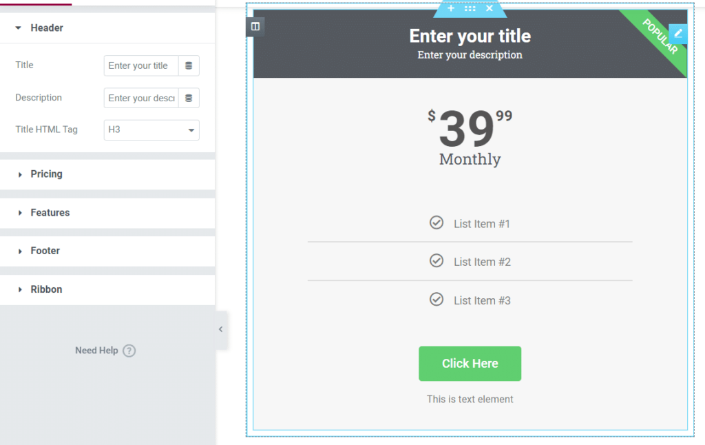 如果您想超越基本的WordPress表格,Elementor可让您访问高度可定制的价格表小工具。这使您能够编辑表格标题、设置Header标签、添加功能列表、调整号召性用语 (CTA) 等等:
