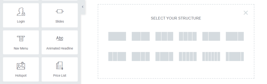 当您准备好添加元素时,您需要选择您希望表格具有的列数。单击编辑器底部的Elementor加号,然后选择要用于价格部分的列结构: