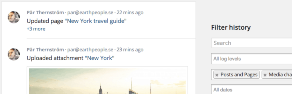 如果您正在寻找用户友好的WordPress活动日志插件,您可以考虑使用Simple History。与此列表中的许多其他工具一样,简单历史记录会记录您网站的重要更改,包括登录尝试失败、内容更新和关键WordPress设置的重新配置。