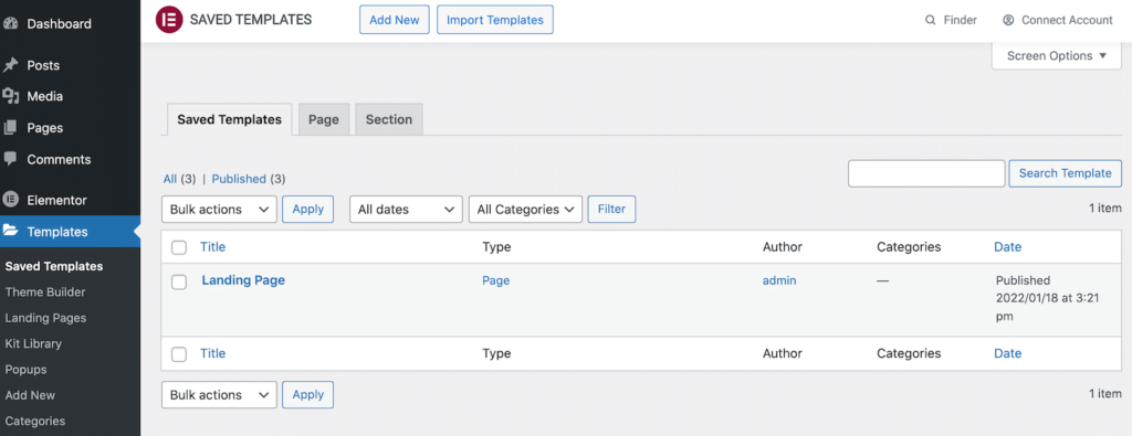 就像更改WordPress主题一样, 在切换到新的Elementor模板之前创建完整备份是明智之举。完成此操作后,您可以通过导航到Templates > Saved Templates来应用新模板。