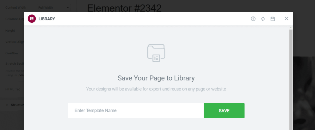 您将看到将设计另存为草稿或模板的选项。如果您选择后者,Elementor会要求您为模板选择一个名称:
