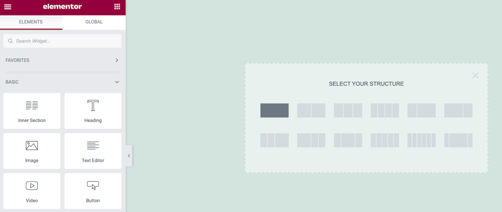 通常,您将首先创建一个部分,方法是单击主画布中的+图标。Elementor然后会要求您选择您的结构。