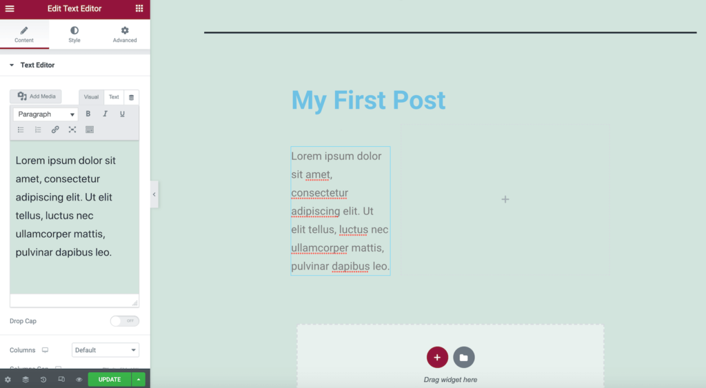 接下来,将Text Editor小部件从Elementor侧边栏中拖放到这个新的Section中。然后,您可以使用侧边栏设置添加和设置文本样式。