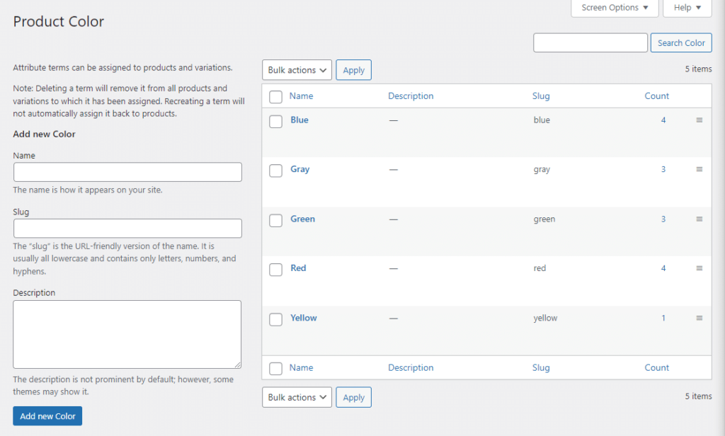 WooCommerce使您能够开箱即用地添加产品属性。您可以根据需要创建任意数量,并将它们划分为独特的特征。例如,如果您将颜色属性添加到您的商店,您可以指定不同的颜色: