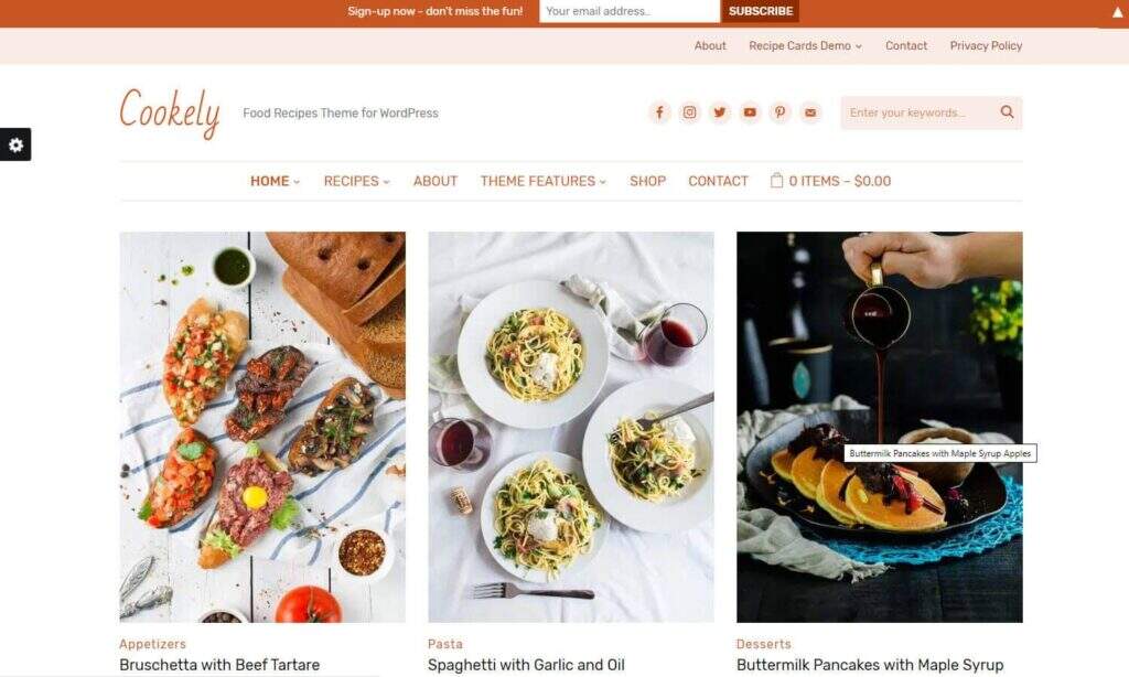 Cookely是运行美食博客的完美伴侣。这是一个组织良好的主页,支持常规博客文章和食谱。您可以分享从食谱花费的时间到放入菜肴中的盐量的所有内容。除此之外,还有几个模块用于电子邮件订阅和社交媒体等。