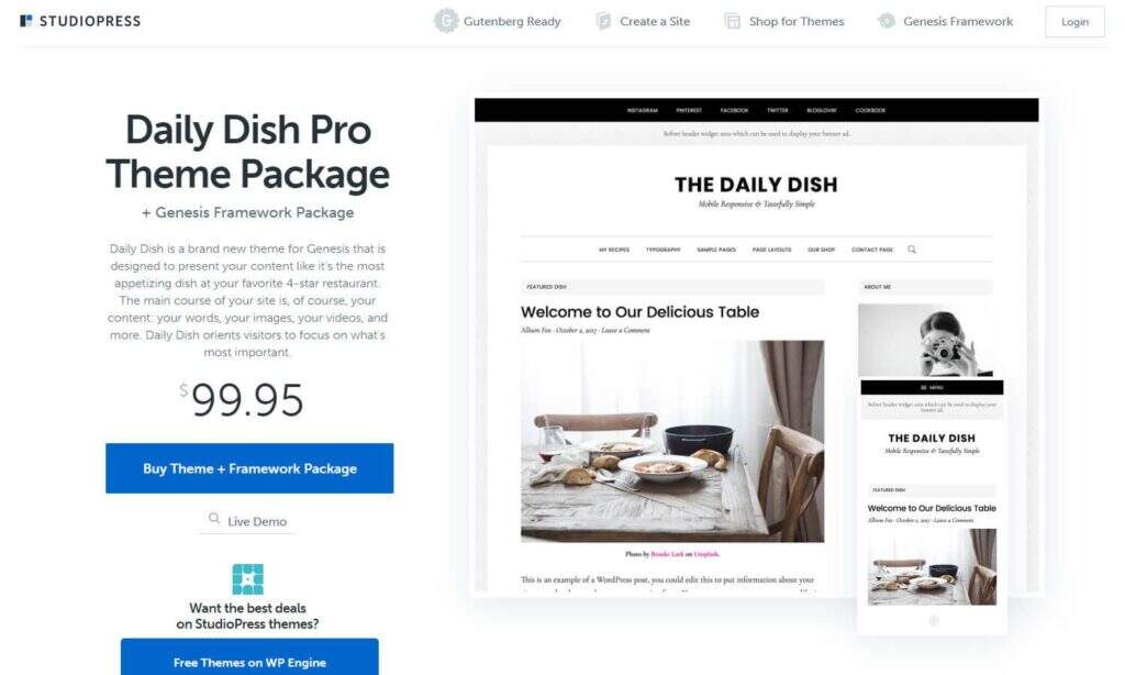 Daily Dish Pro来自StudioPress。因此,它运行在强大的Genesis框架上。至于美食博客,Daily Dish Pro主题布局简洁,带有漂亮的博客,可以展示您的图像和写作。这没有您在其他主题中可以找到的任何特殊食谱工具,因此更多的是关于编写和显示图片。