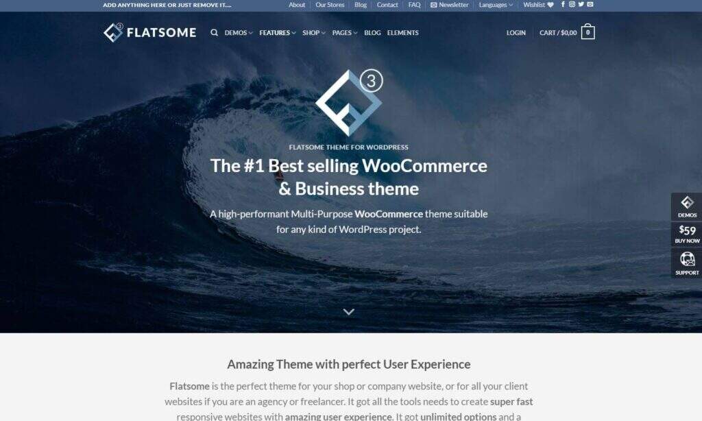 Flatsome为小型和大型商店提供了正确的设置。它是ThemeForest上最畅销的WooCommerce主题之一,它有一个实时页面构建器,其中包含用于构建在线商店的特定模块。快主题还提供一键演示内容,开始设计,接近你想要的店面外观。