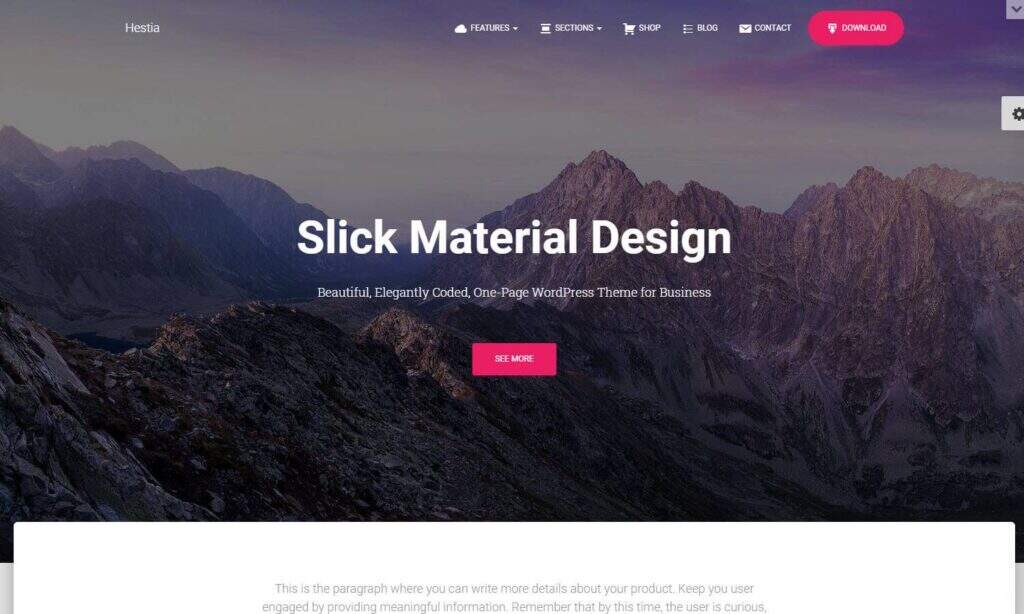 Hestia来自ThemeIsle,它是对设计各种网站感兴趣的创意人士的完美网站伴侣。现代的材料设计确保您的内容流行,各种演示意味着您可以构建作品展示/作品集或标准商业网站。