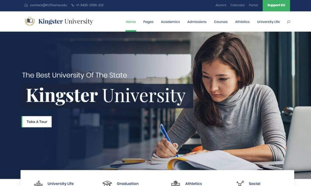 Kingster是制作大学或学校网站的主题。该主题允许您共享某些文章类型并实施课程搜索系统。您可以添加可自定义的课程过滤器并选择适用于教育机构的预建页面。