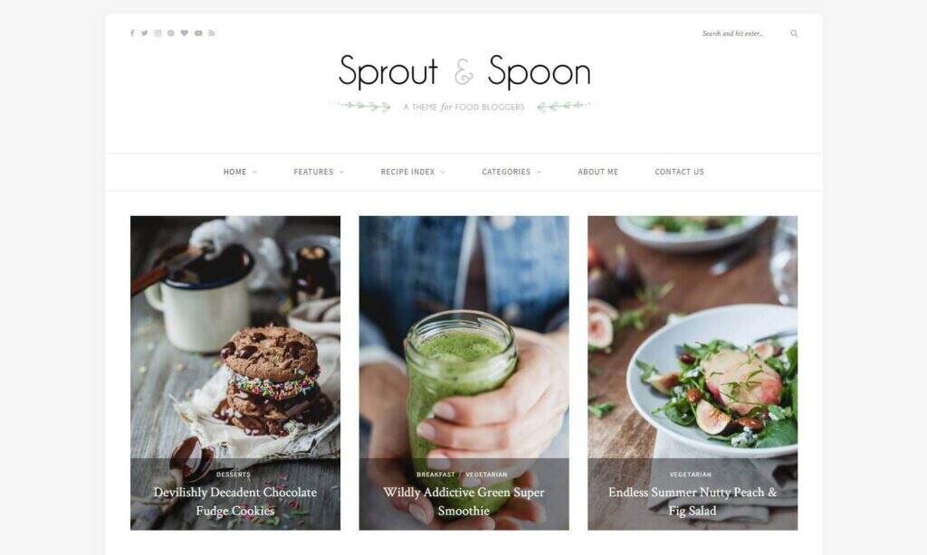 Sprout and Spoon适合更优雅的美食博主。它具有令人难以置信的博客设计,带有引人注目的特色图片和自定义食谱卡工具。这是一个易于定制的欢迎设计,几乎可以搭配任何徽标或颜色。