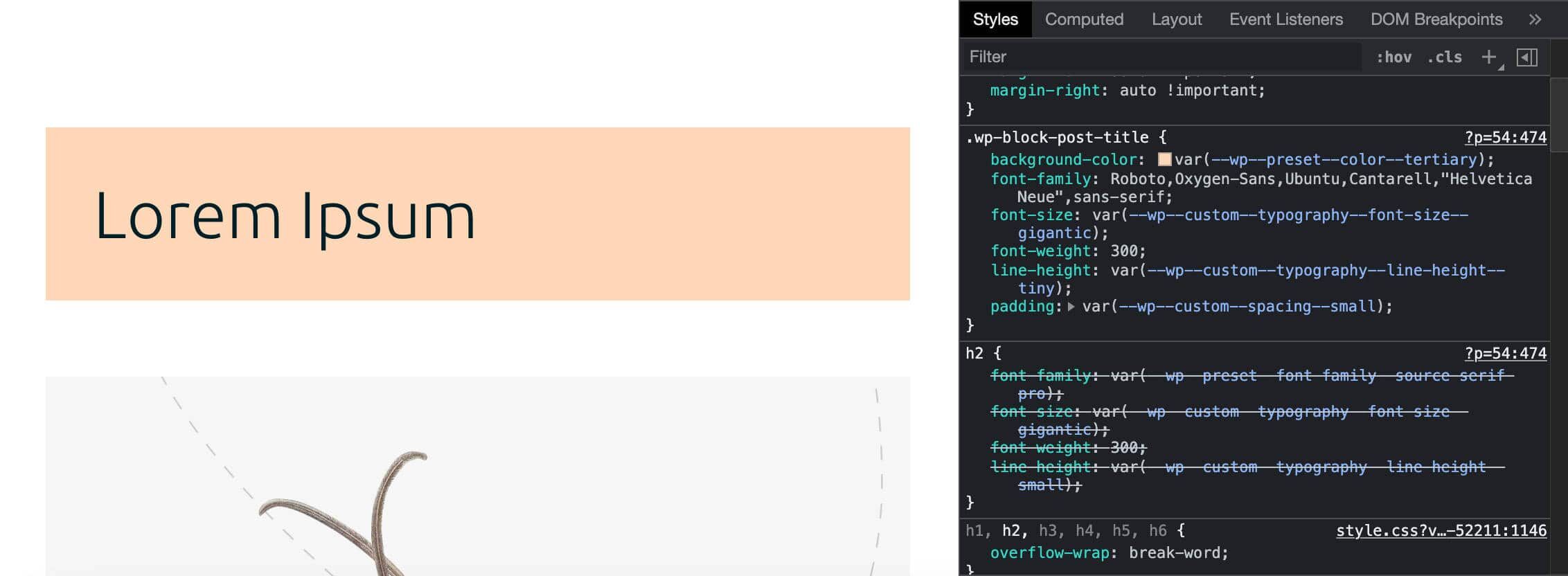 现在假设您要覆盖文章标题和组区块样式。您需要做的就是定义要添加或覆盖的样式,如下所示: