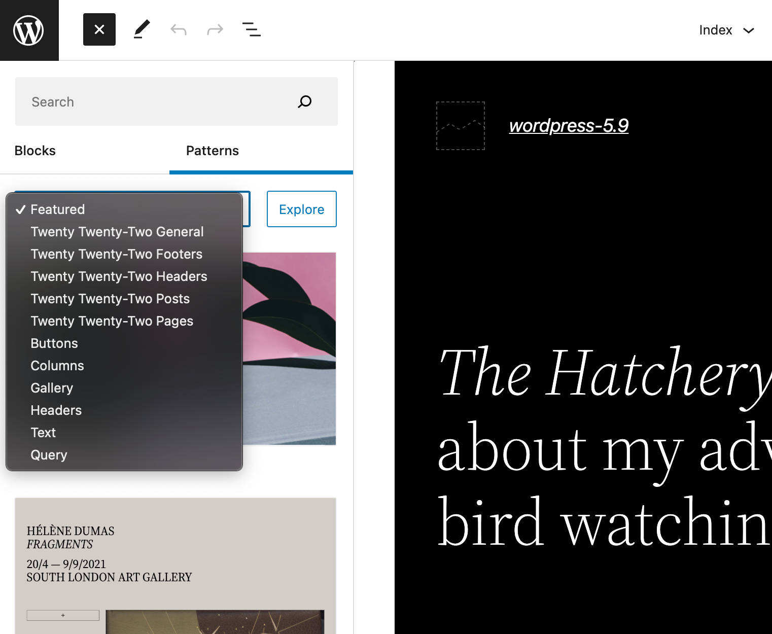 WordPress 5.9通过新的Pattern Explorer对样板系统进行了重大改进,该工具允许您以全屏模式浏览样板。