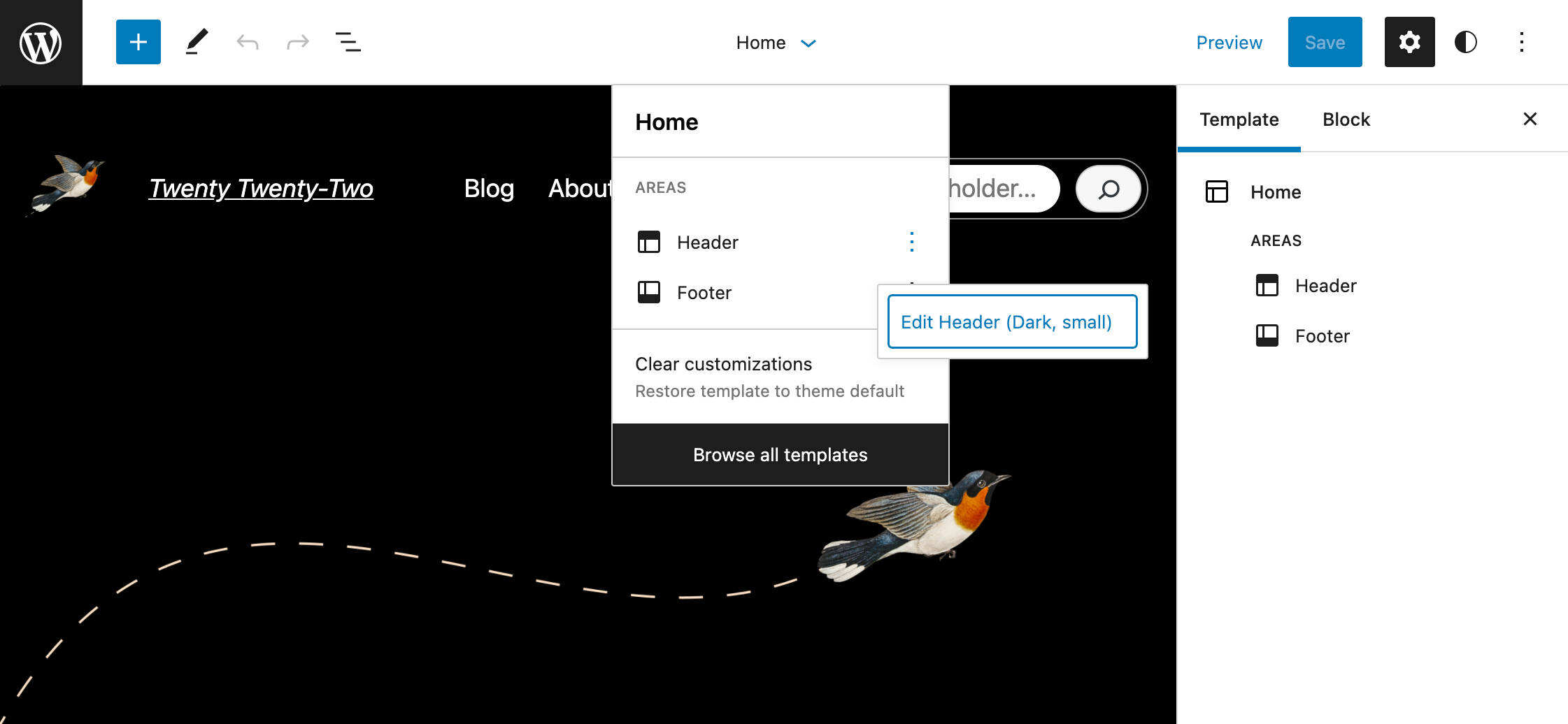 通过单击任何模板区域(例如页眉),您将被直接带到您要编辑的模板部分。