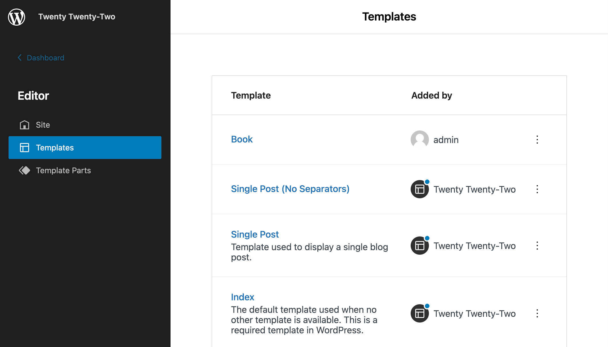 Template Parts菜单项列出了您可以在编辑器中打开以进行自定义的可用模板部件。