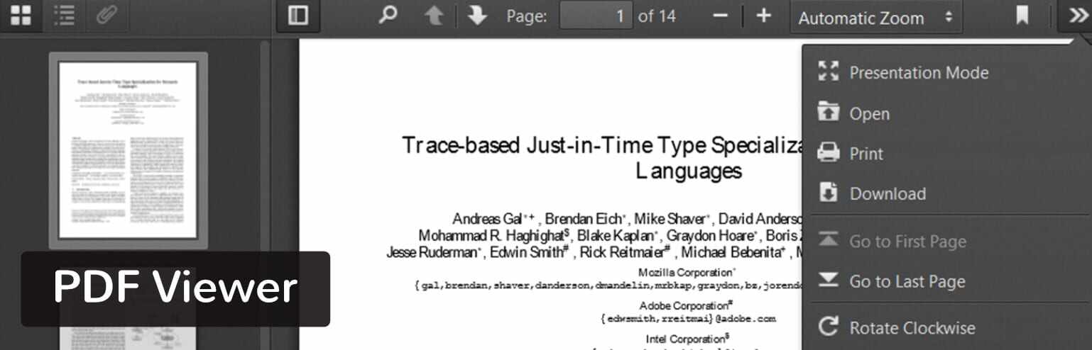 无论如何,该插件仅使用JavaScript,从而在前端提供流畅的体验。这也意味着您的用户无需安装任何其他浏览器软件即可查看PDF。除此之外,查看器还有多种工具,包括页面跳转、缩放和书签。