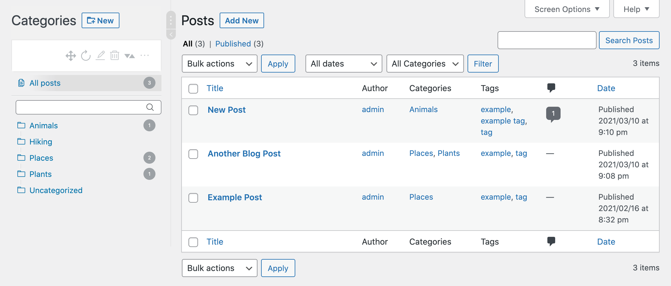 您可以创建、编辑和删除分类目录,以及从WordPress仪表盘的“文章”屏幕将文章拖放到其中 。这可以加快内容管理,还可以让您大致了解您在网站上发布的文章。