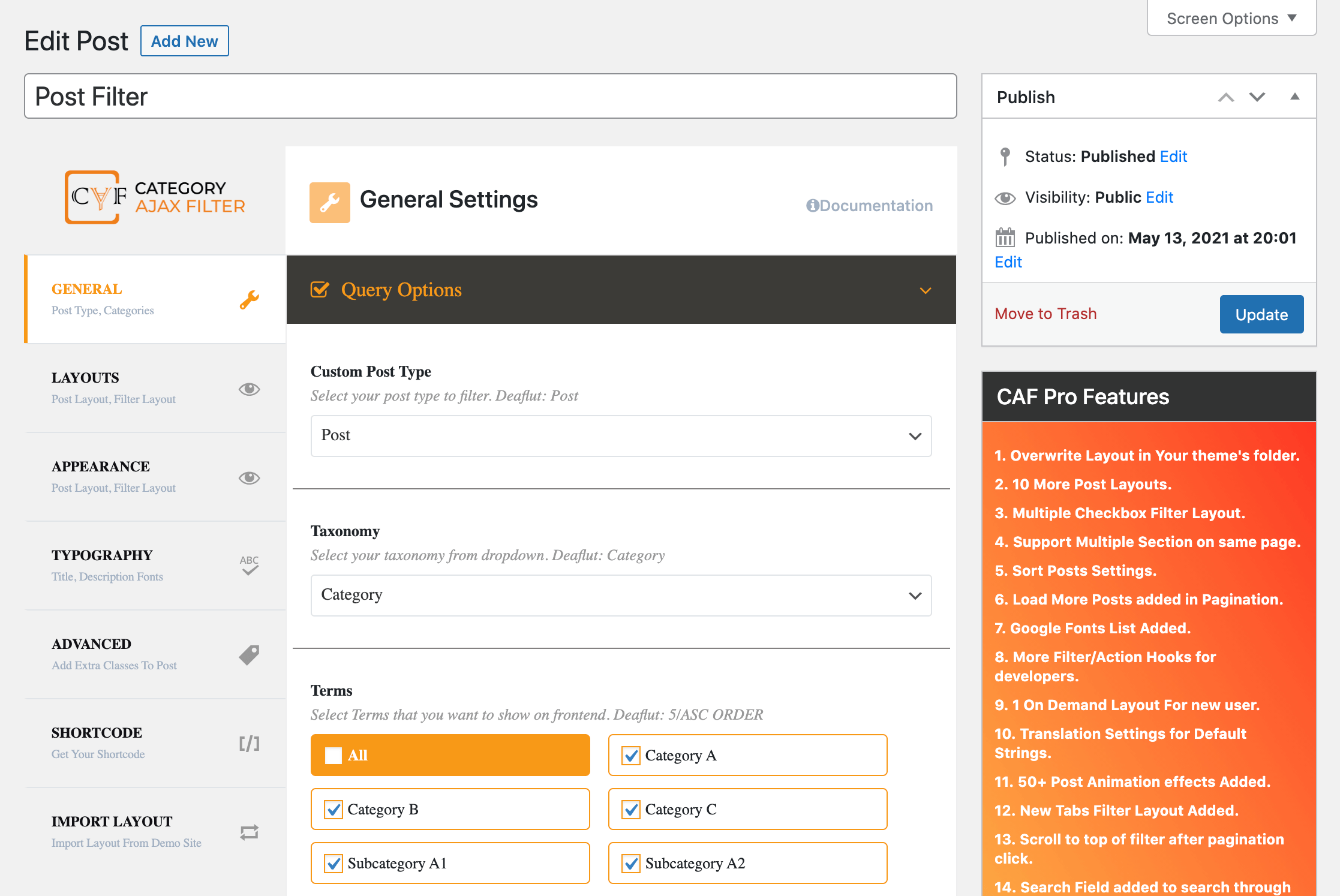 安装插件后,您可以创建和发布自定义文章分类目录筛选器:
