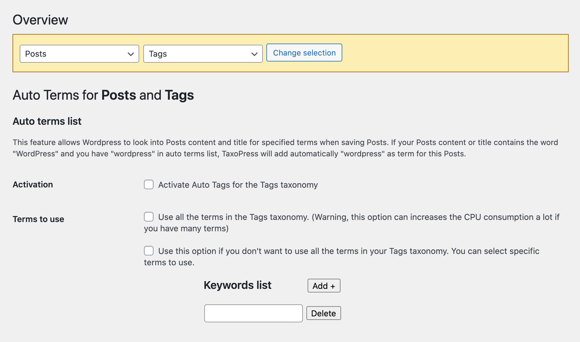 一个特别有用的功能是TaxoPress的自动分类功能。此选项允许您指定要与特定标签或类别相关联的某些单词或短语。该插件将扫描您的内容以查找这些术语,并将它们链接回相关分类法的存档页面: