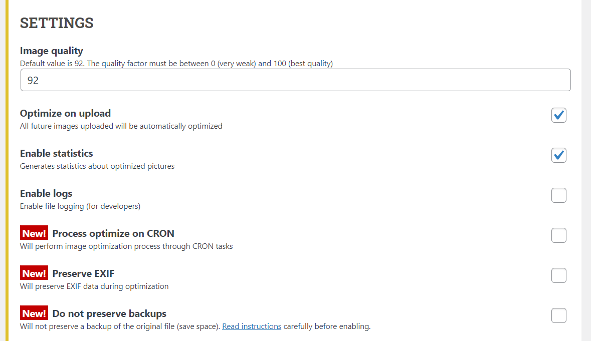 如果您深入研究插件的高级设置,您可以选择是否要从图像中删除元数据、为媒体文件创建备份,甚至调整它们的大小: