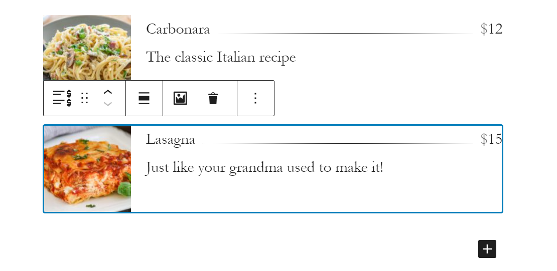 您可以使用价格列表块将任意数量的菜单项添加到任何页面 。它包括多个样式选项,例如备用标题标签,分隔线等。此插件还使您可以添加推荐区,这是对每种菜肴或餐厅本身进行评论的绝佳方式。