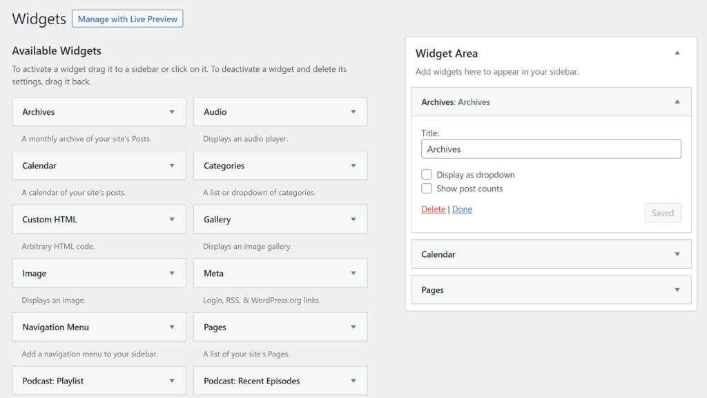 如果您开始使用新的基于区块的窗口小工具系统,则在启用此插件时,将丢失所有窗口小工具区块。注意:没有回头路了,所以请确保这是您想要的。如果您改变主意并停用Classic Widget,则先前的区块将不会重新出现。