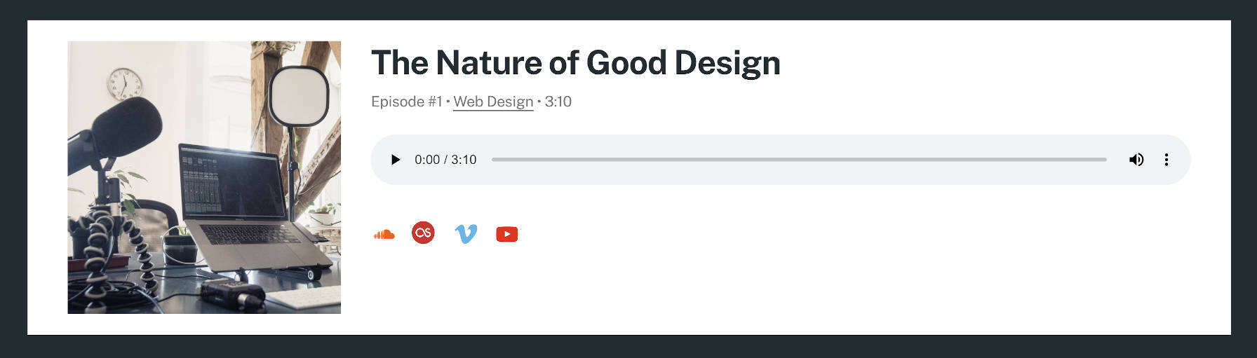 基于原始模式,我构建了一个使用SoundCloud嵌入而不是Audio区块的模式。我还创建了另一个带有一些更改的内容,这些更改更多地适合播客。