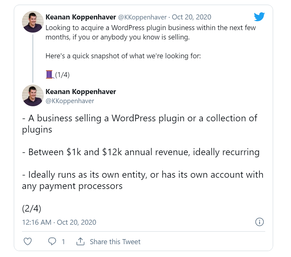 WordPress开发人员Corey Maass于2015年为WordPress创建了Kanban,但一直在努力维护更新,至今拥有超过2000名用户。2020年,他在推特上看到Alpha Particle首席技术官Keanan Koppenhaver在Twitter上发帖,称他正寻求收购插件业务,并抓住了出售WordPress插件Kanban的机会。Koppenhaver想要一个年收入在1-1.2k美元之间并且不与Beaver Builder,Elementor,Divi或任何其他页面构建器捆绑在一起的插件。与WooCommerce或其他第三方软件的集成是一个加分项。