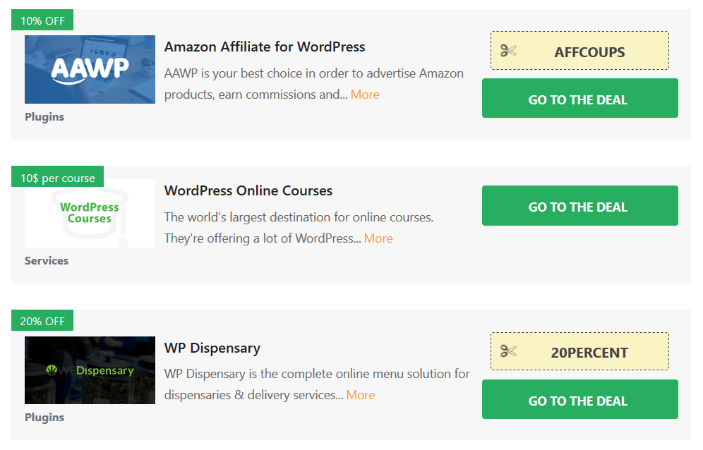 您可以在专用页面上显示优惠券,甚至可以在小组化部分的网站边栏上显示特价优惠。 您还可以为帖子和页面添加优惠券,将优惠券链接到供应商,当然,也可以在网站访问者购买时获得佣金。