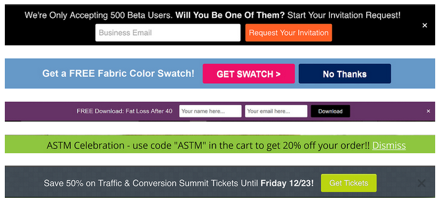 您不仅可以使用上述活动触发器为网站访问者提供诱导广告,您还可以使用8种活动类型的任意组合:灯箱弹出窗口,全屏欢迎垫,滑入式滚动框,浮动条,倒计时器 ,侧边栏和内联表单,甚至是内容储物柜。
