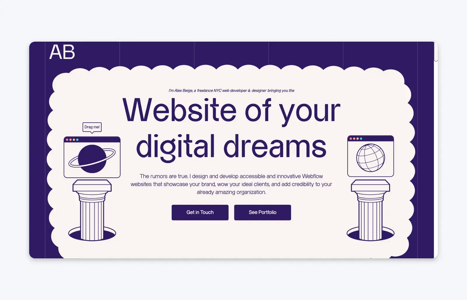 Alex Beige 是纽约市的一名自由职业者。如果您需要将功能性和用户体验与个性和趣味性融为一体的创意,他们的网站开发人员作品集值得一看。Alex 包含潜在客户可能想知道的所有信息: 他的经验和技能、特色网站项目(附带每个项目的图片)、他的工作流程、与他合作的感受以及如何取得联系。此外,这一切都展现了亚历克斯轻松愉快的风格–比如他的工作流程是如何以云图的形式呈现的,你可以点击并拖动云图在页面上重新排列。