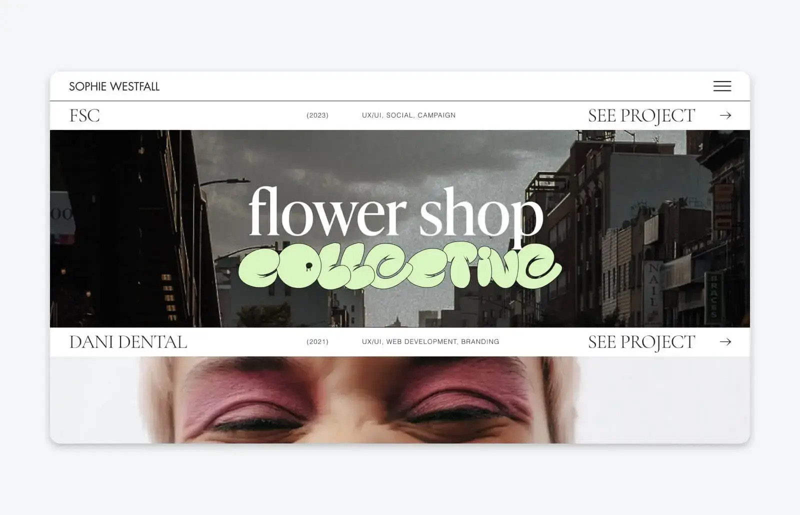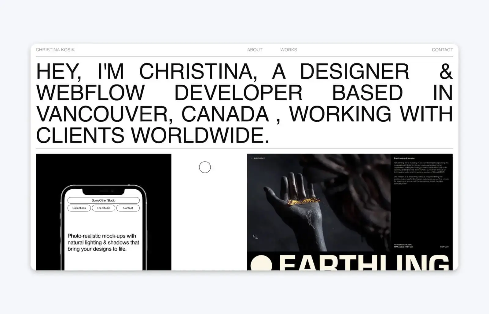 加拿大设计师兼 Webflow 开发人员克里斯蒂娜-科西克(Christina Kosik)利用她的作品集确保最重要的部分熠熠生辉: 她的作品。