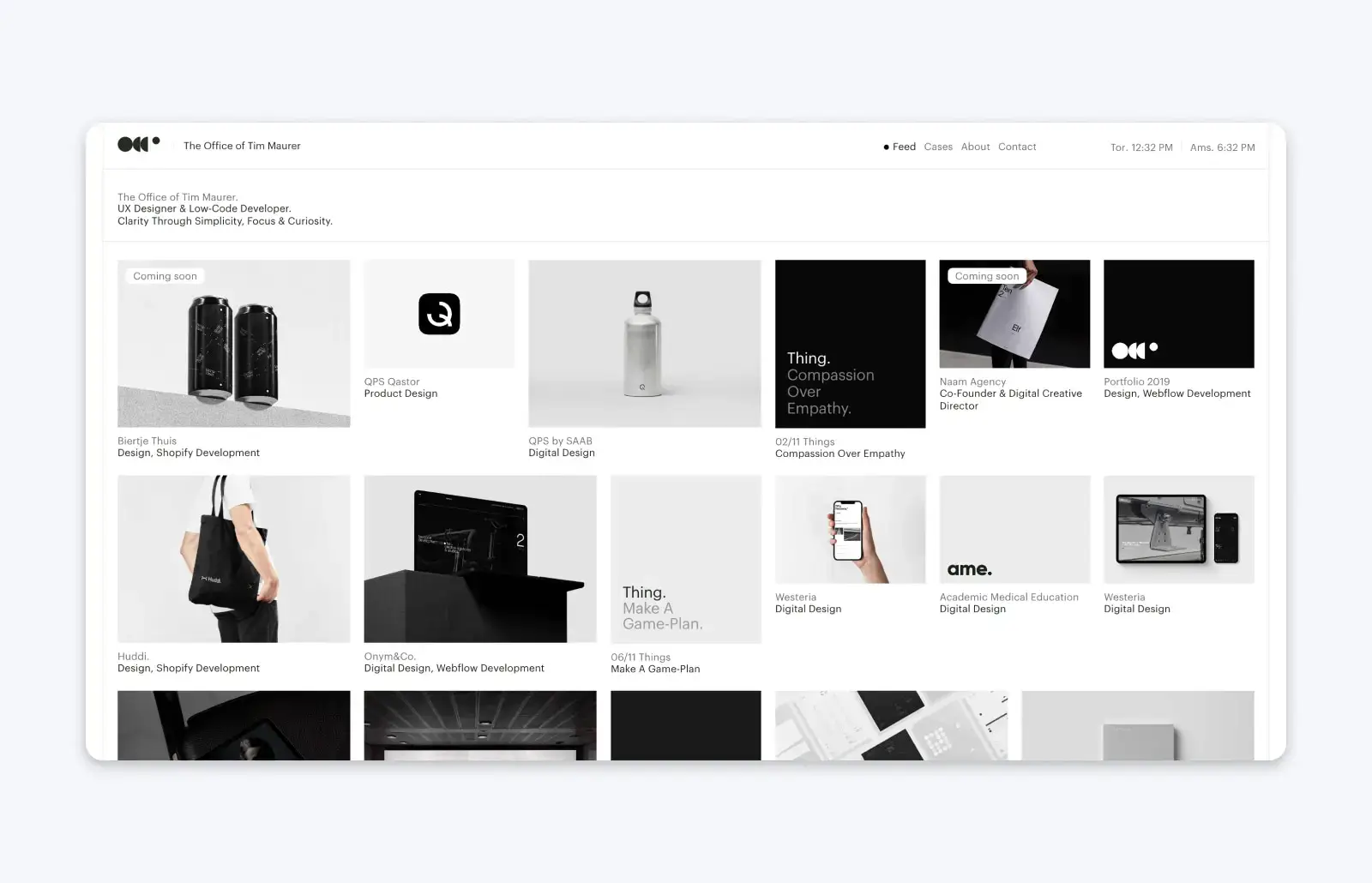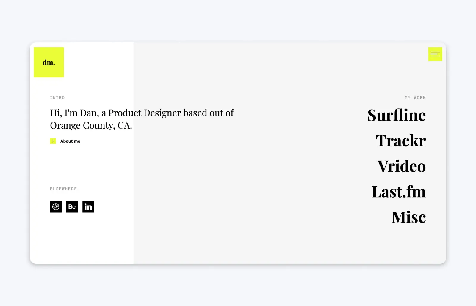 从他的作品集中就可以看出这一点,他使用了简单的布局,将他过去的所有项目串联起来。他有多年的经验可以展示,而这个简洁的作品集可以帮助他展示他为过去的客户所完成的工作的真正广度–而不会让作品集有压倒性的感觉。