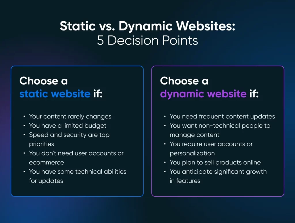 虽然没有放之四海而皆准的“正确”选择,但在静态网站和动态网站之间做出选择是一个相当简单的决定。