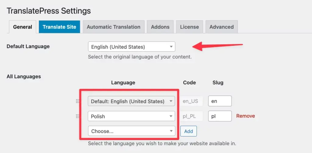 接下来,您必须告诉 TranslatePress 您想在网站上使用哪些语言。您可以在“设置”→“TranslatePress”中这样做。列表中的第一种语言是您网站的默认语言。您可以直接在其下方添加第二种语言。