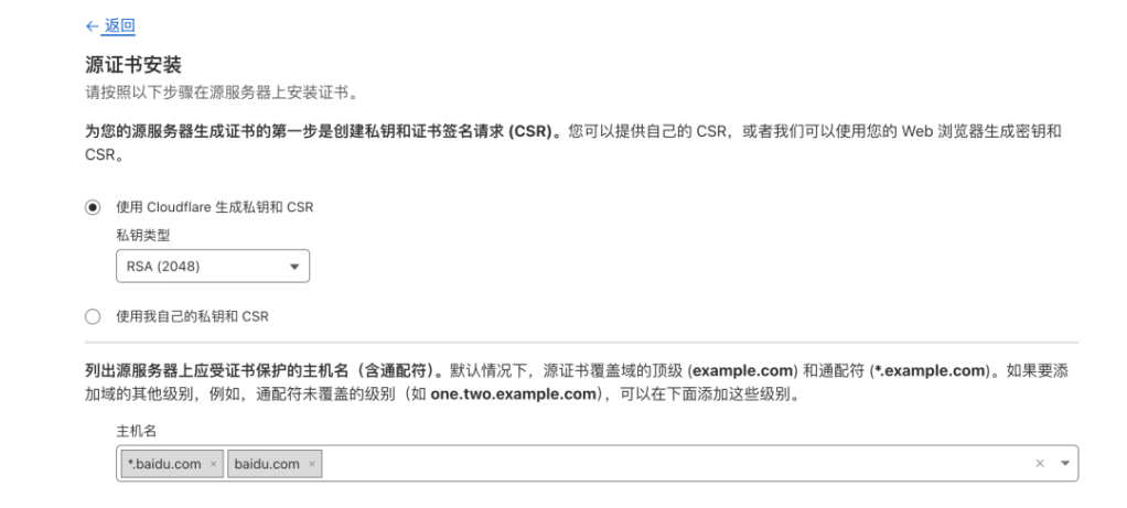 使用 Cloudflare 生成私钥和 CSR。可选择 RSA 或 ECC 私钥类型,推荐新手选择这种方式。