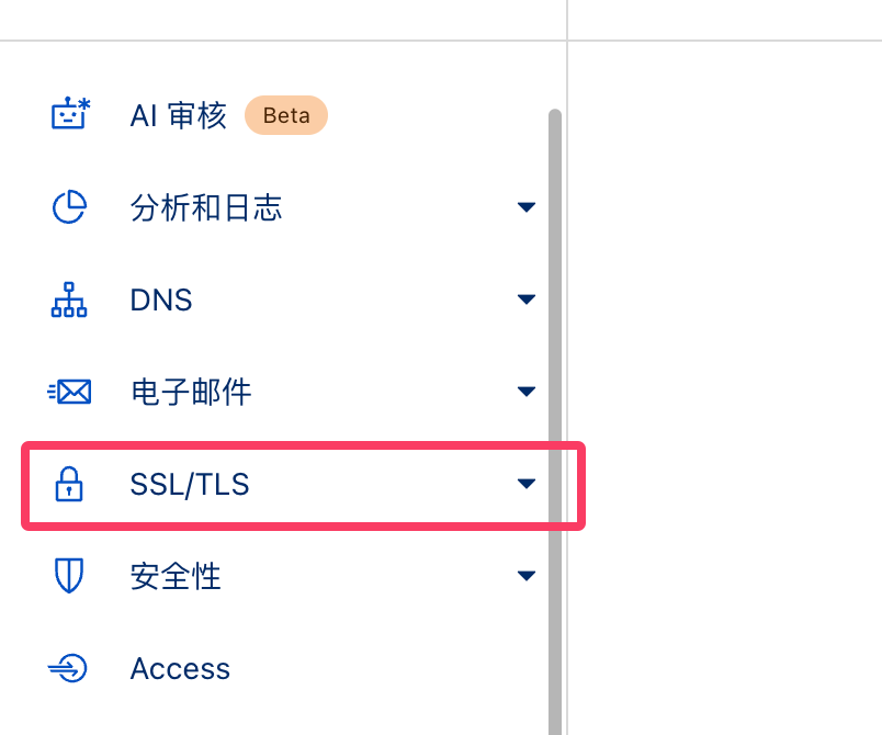 从域名列表中选择需要申请证书的域名,在左侧菜单栏找到并点击 SSL/TLS。