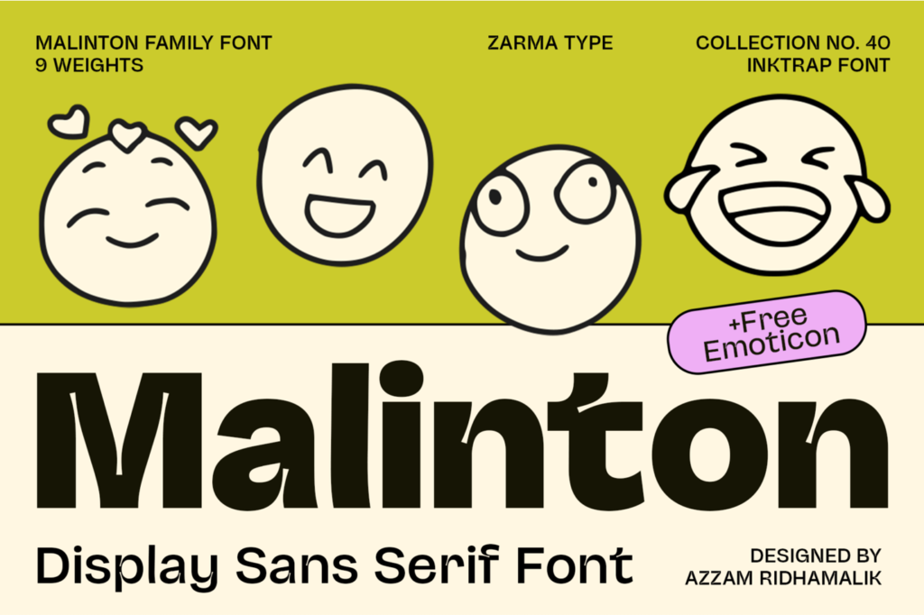 Malinton 是一款俏皮多变的无衬线显示字体,旨在以个性和风格提升您的设计。它有 9 种重量、360 多个字形,支持 85 种以上的语言,还有独特的表情符号,非常适合用于徽标、社交媒体、标题等。通过现代墨迹和可变字体技术,Malinton 在创意和专业性之间取得了理想的平衡。