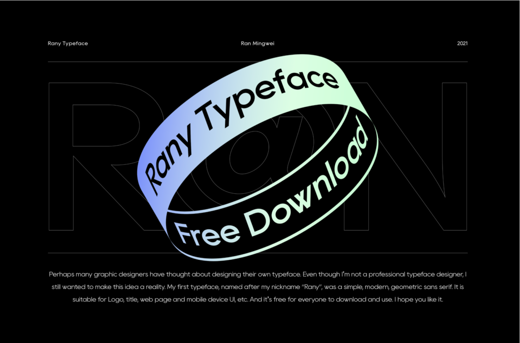 这款名为 “Rany” 的字体是一款现代几何无衬线字体,设计简洁,用途广泛。Rany “是由一位设计师将自己的想法变为现实而创作的,非常适合徽标、标题、网页和移动 UI 设计。尽管创作者并不是专业的字体设计师,但他们的目标是设计出一种易于使用、功能强大、适用于各种应用的字体。