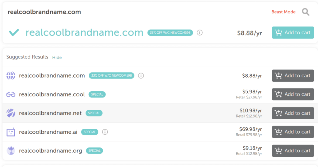 有些后缀可能比其他后缀更贵。如果您选择了一个您知道可用的域名和域名后缀,您可以在几个注册商那里货比三家,看看谁提供的价格最优惠。