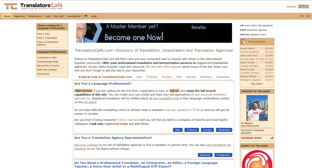 - TranslatorsCafe 拥有一个庞大的社区,注册用户超过 439,000 人。虽然并非所有用户都很活跃,但您仍然可以接触到很多自由译者。